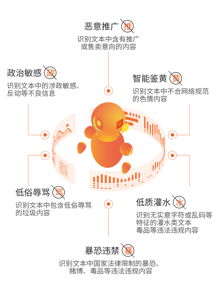 运用业界当先的深度学习技术,判断一段文本内容是否符合网络发文规范,实现自动化、智能化的文本审核,大幅节省内容审核的人力成本,为您的产品体验保驾护航。