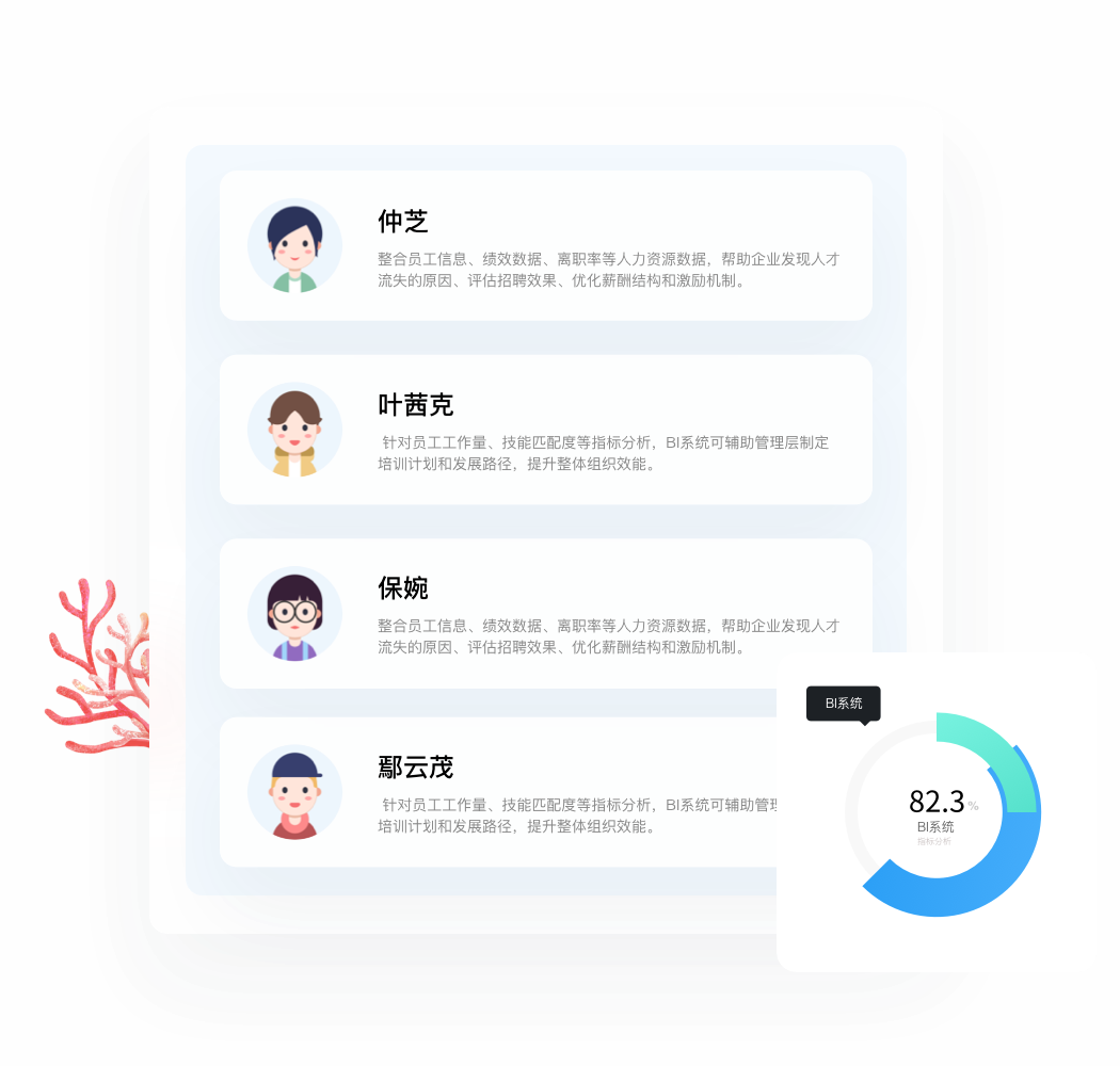 • BI系统整合员工信息、绩效数据、离职率等人力资源数据,帮助企业发现人才流失的原因、评估招聘效果、优化薪酬结构和激励机制。