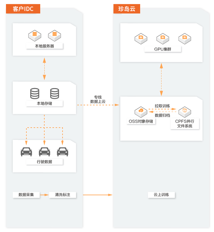 需要训练的数据,从 OSS 导入到 CPFS,利用 GPU 和 CPFS 文件系统的强大处理能力,在云端进行模型训练