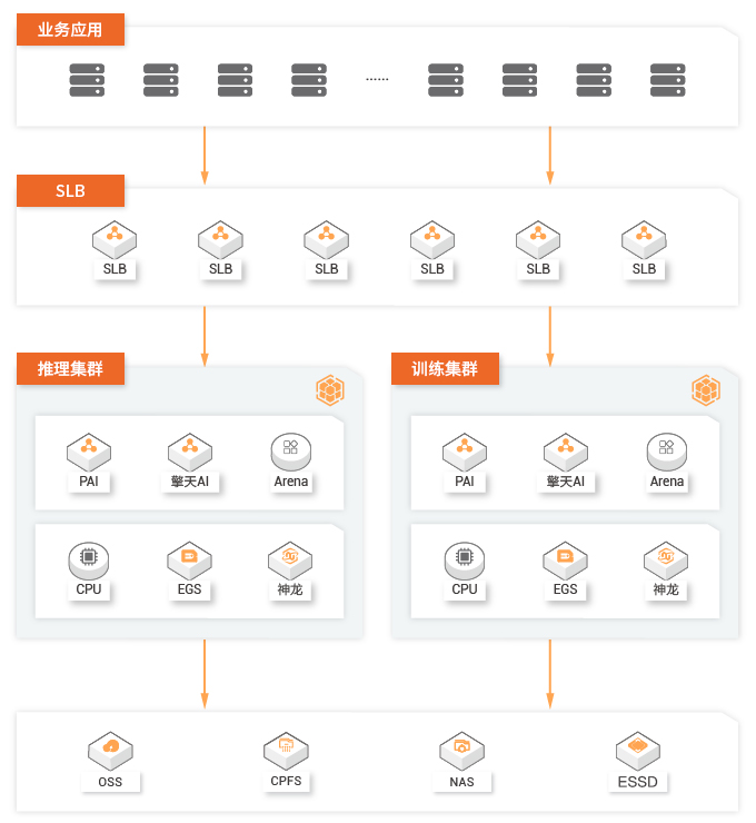将 CPFS 、NAS、OSS 和 ESSD 等多个存储产品组合与 GPU 云服务器、SCC、神龙弹性裸金属等计算集群无缝对接。通过容器化部署服务实现资源弹性调度,提供超高吞吐和超高 IOPS 能力,支持混合云、线下和云上部署,快速构建AI基础环境