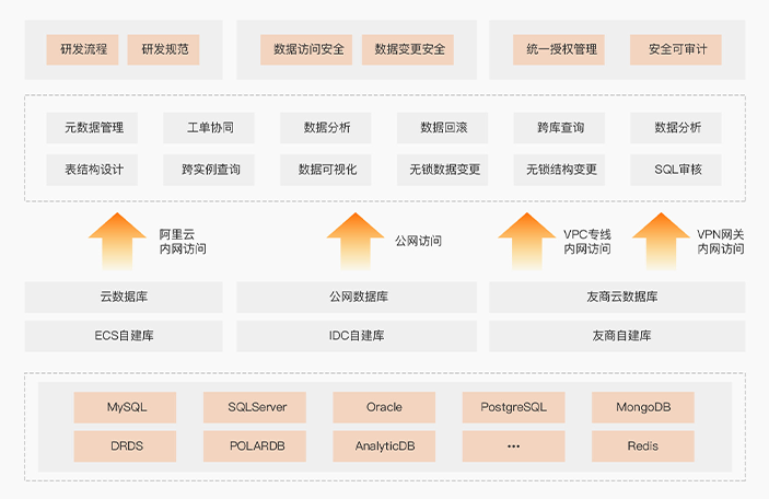 支持云数据库、ECS自建数据库、本地IDC自建数据库、友商云数据库、友商云服务器自建数据库多个来源进行统一管理,悉数支持关系型数据库、OLAP数据库、NoSQL数据库等多种数据库类型