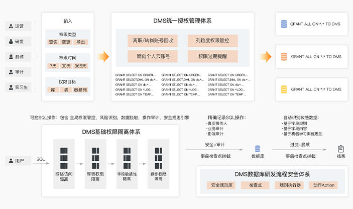数据管理(Data Management Service,简称DMS)是一种高效、安全、悉数的数据库开发工作环境。通过DMS,你可以在一个GUI开发环境中完成20多种关系型数据库、NoSQL及数据仓库的数据库开发设计及性能诊断工作。DMS-安全协同管控模式通过研发规范、研发流程、权限控制、数据脱敏、安全审计及变更回滚等功能有效保障数据安全。