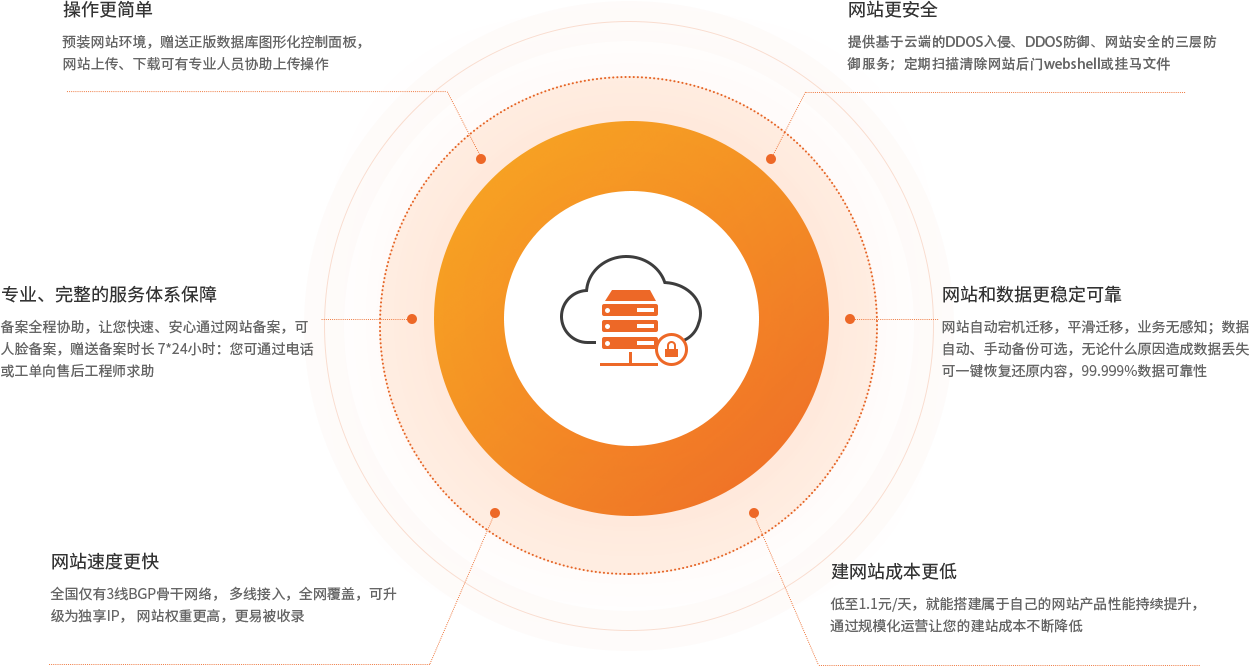 | 普惠版 | 1300 | 网页空间:300M 数据库100 | 峰值带宽:2MBPS(高速访问保证)高速流量:200GB | |