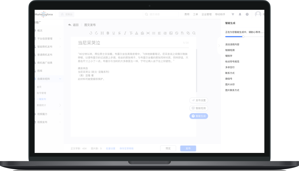 多体裁一键同步分发百家号、头条号、知乎、微信公众号等多家主流自媒体平台,丰富营销内容形态,高效传播品牌价值,减少繁琐重复操作。