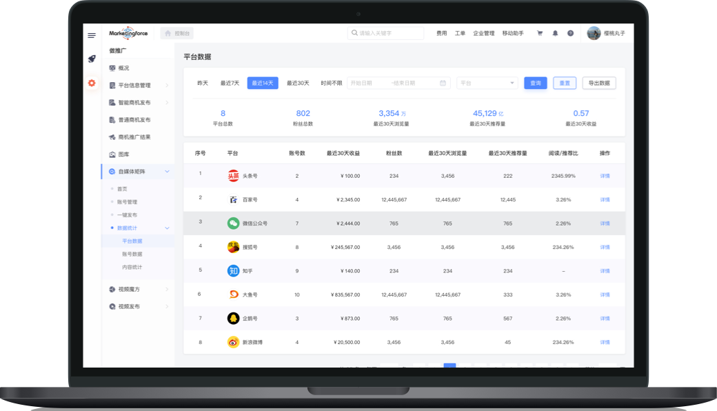 账号数据、内容数据同步更新,数据回流分析与数据可视化,内容效果快速洞察,辅助多元化的运营决策,助力品牌全平台营销推广。