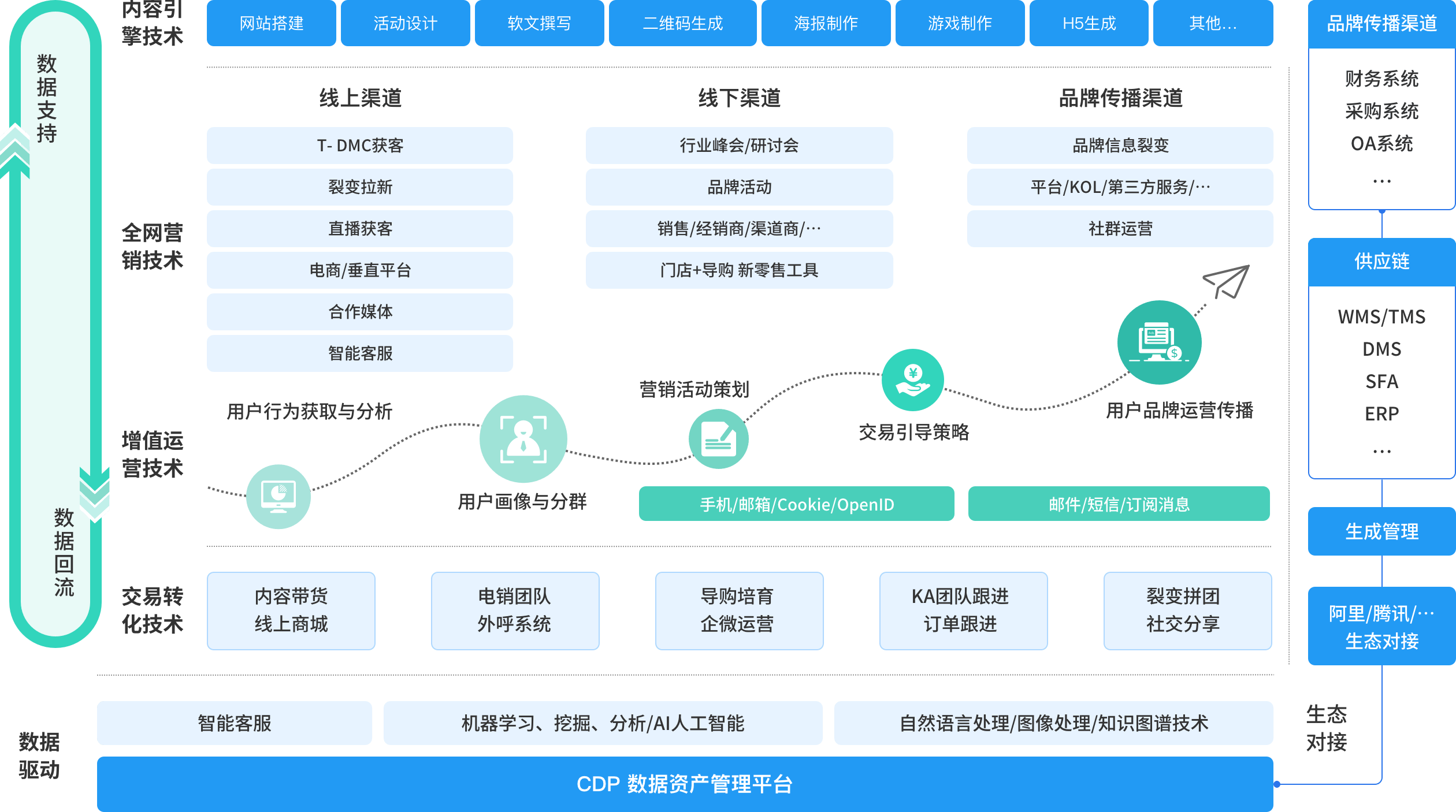 珍客SCRM以客户数据平台CDP为底座,实现前后端、公私域数据贯通,清晰客户意向,辅助精准决策,结合智能营销工具,投客户所好,提升品牌认同度,把每一位客户都打造成忠实粉丝。